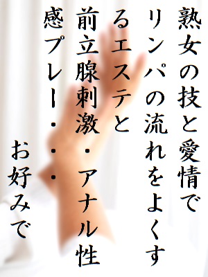 疲れた体を 性感エステで 身体をリラックスしていただいたら 性感プレイで 熟女さんのテク二ックで夢の世界に導きます
